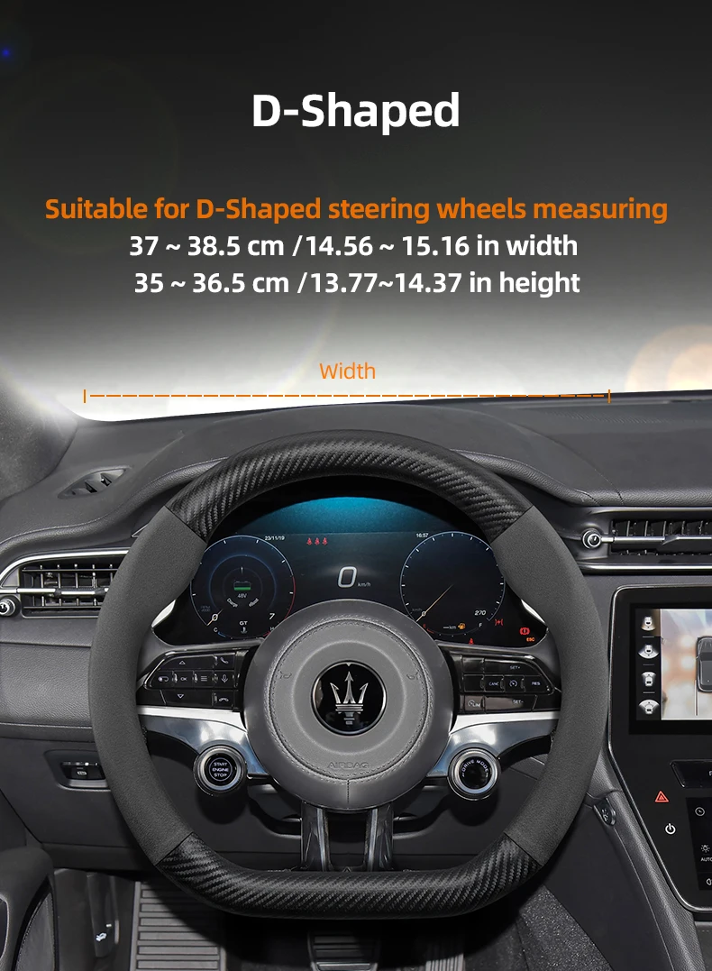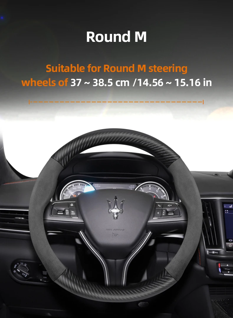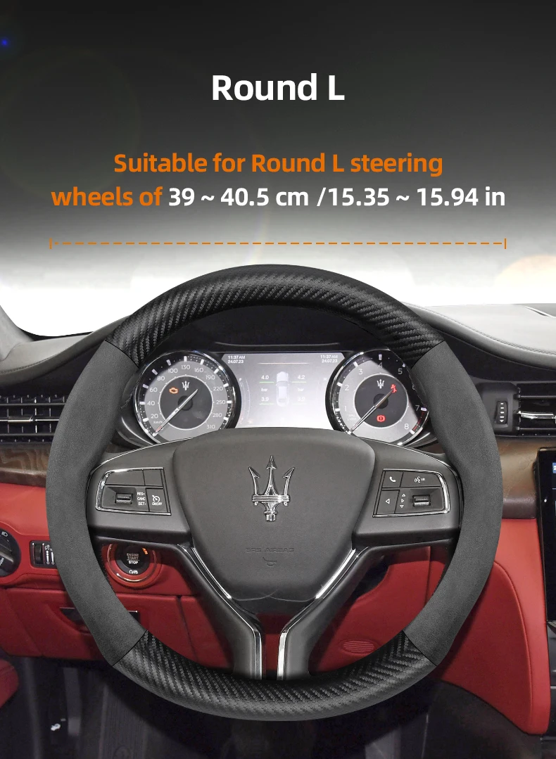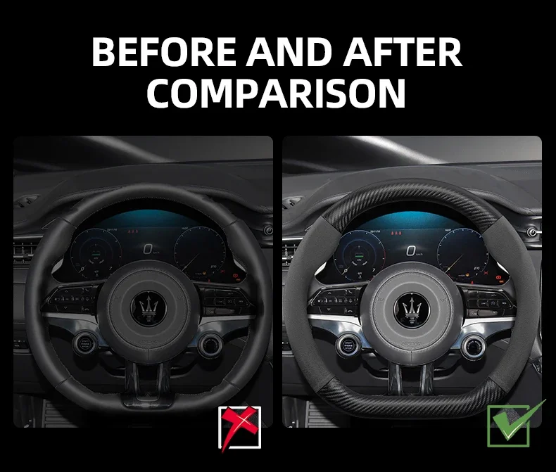Premium suede and carbon fiber PU leather steering wheel cover designed specifically for Maserati models. Enhanced grip and luxurious feel while protecting your original steering wheel from wear and damage.