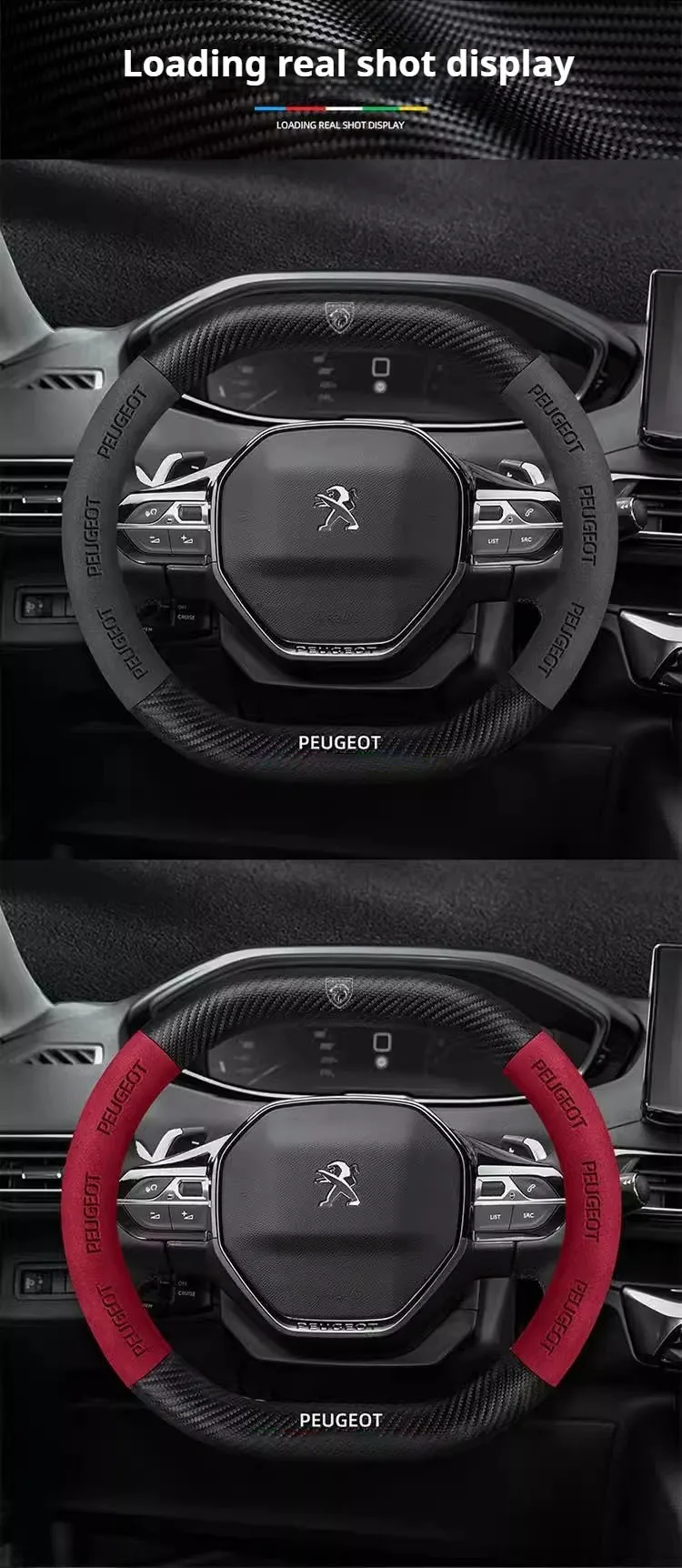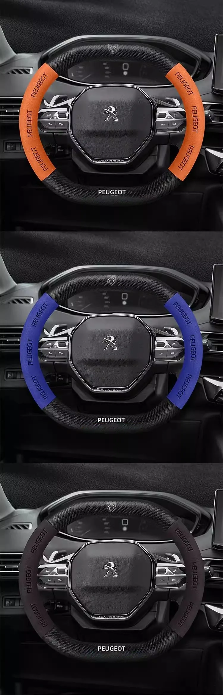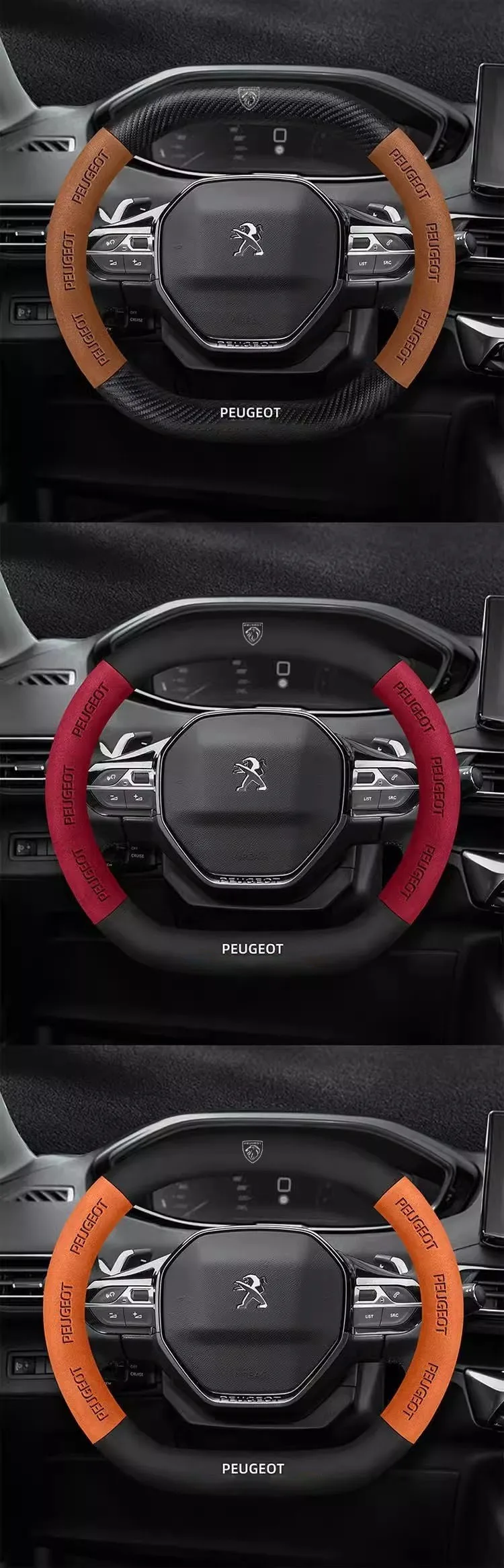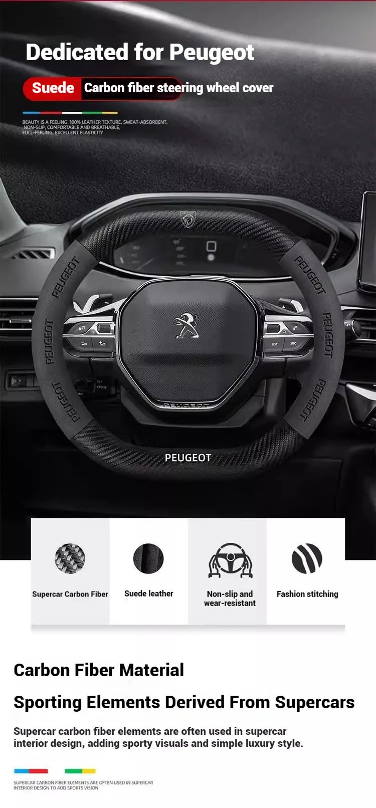 Premium suede leather steering wheel cover designed specifically for Peugeot models. Features carbon fiber accents and non-slip grip technology for enhanced driving comfort and control. Easy installation with perfect fitment guarantee.