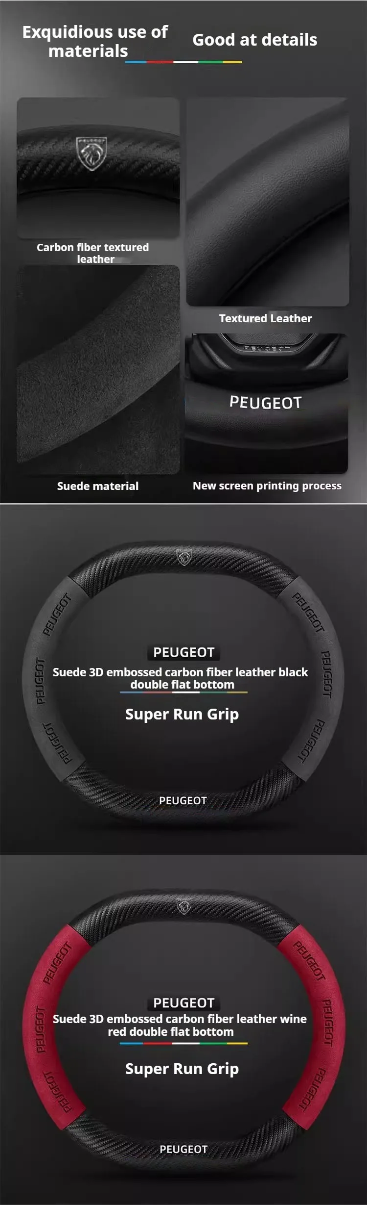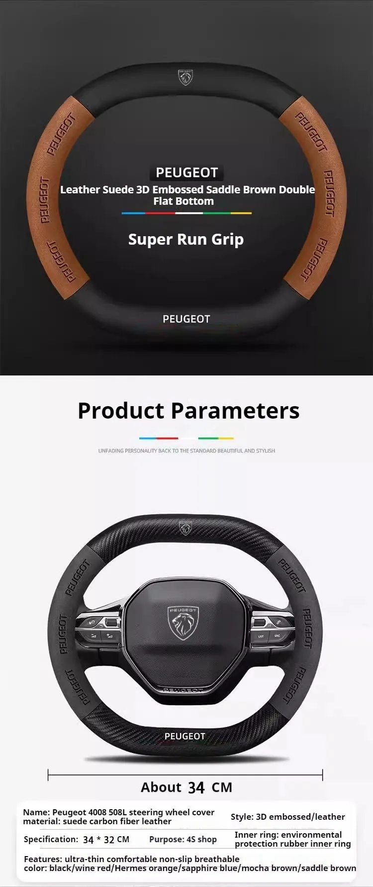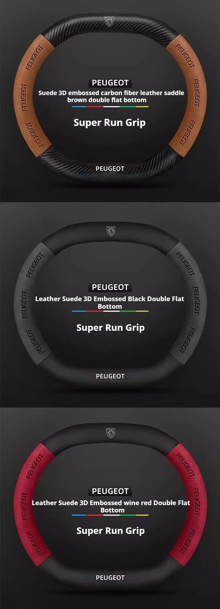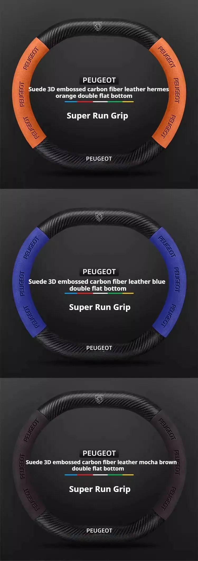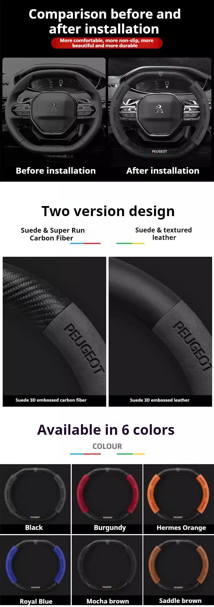 Premium suede leather steering wheel cover designed specifically for Peugeot models. Features carbon fiber accents and non-slip grip technology for enhanced driving comfort and control. Easy installation with perfect fitment guarantee.