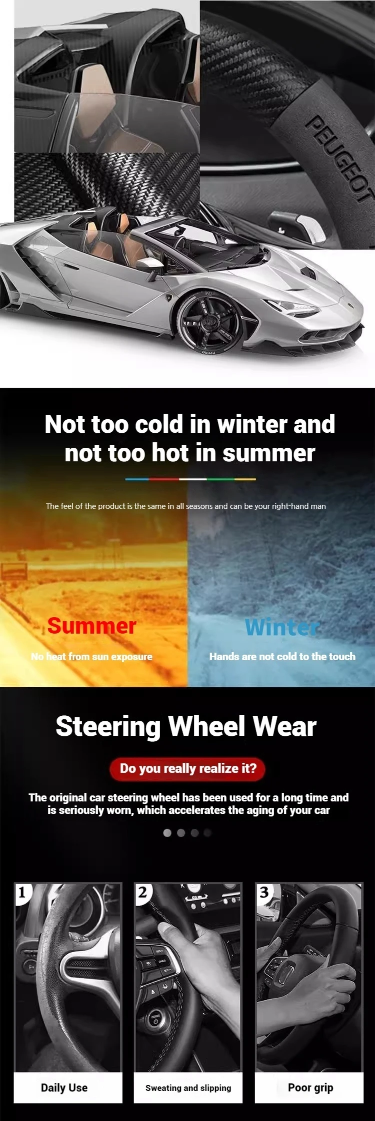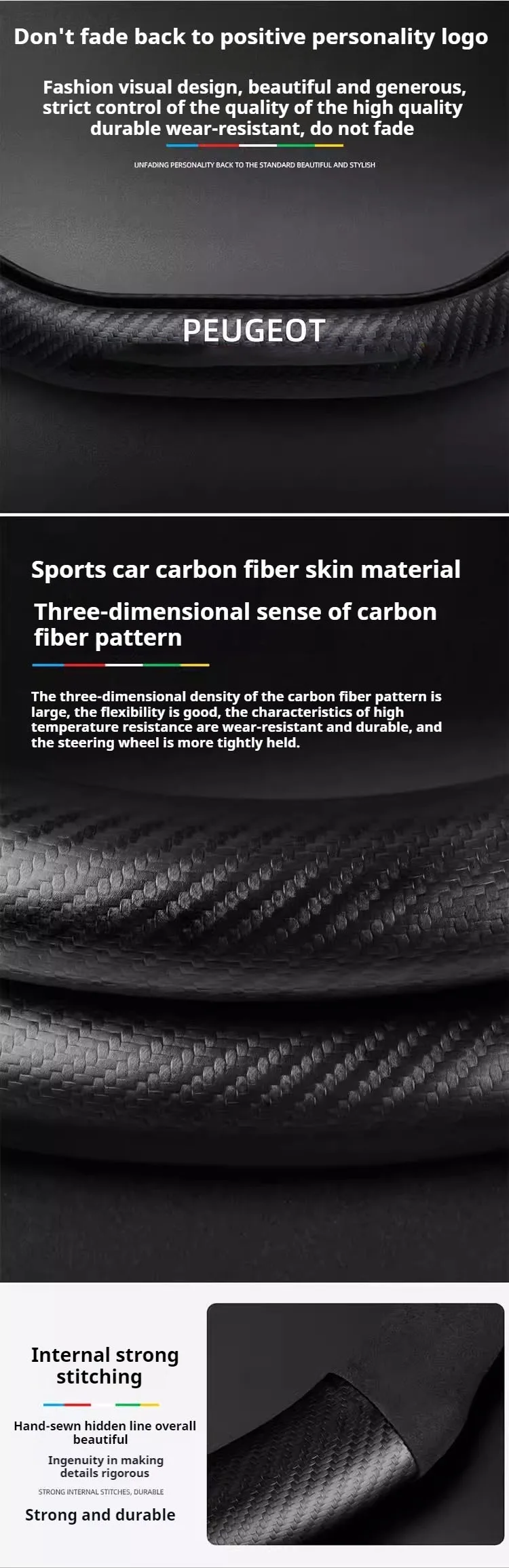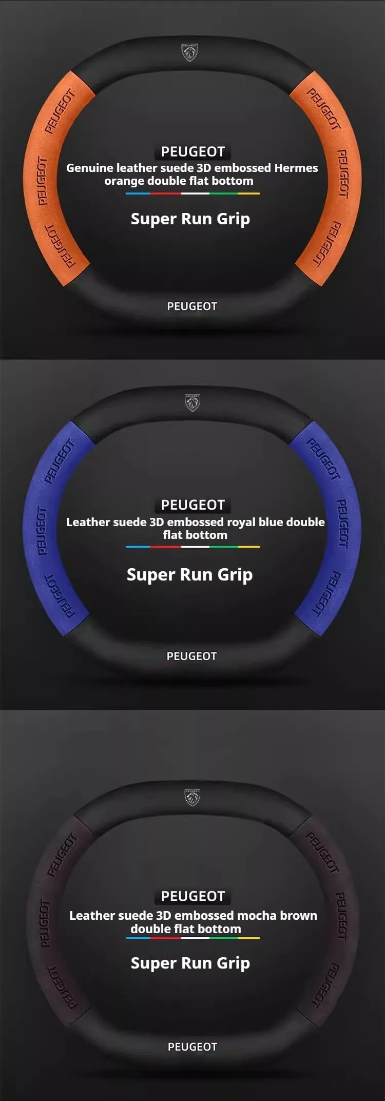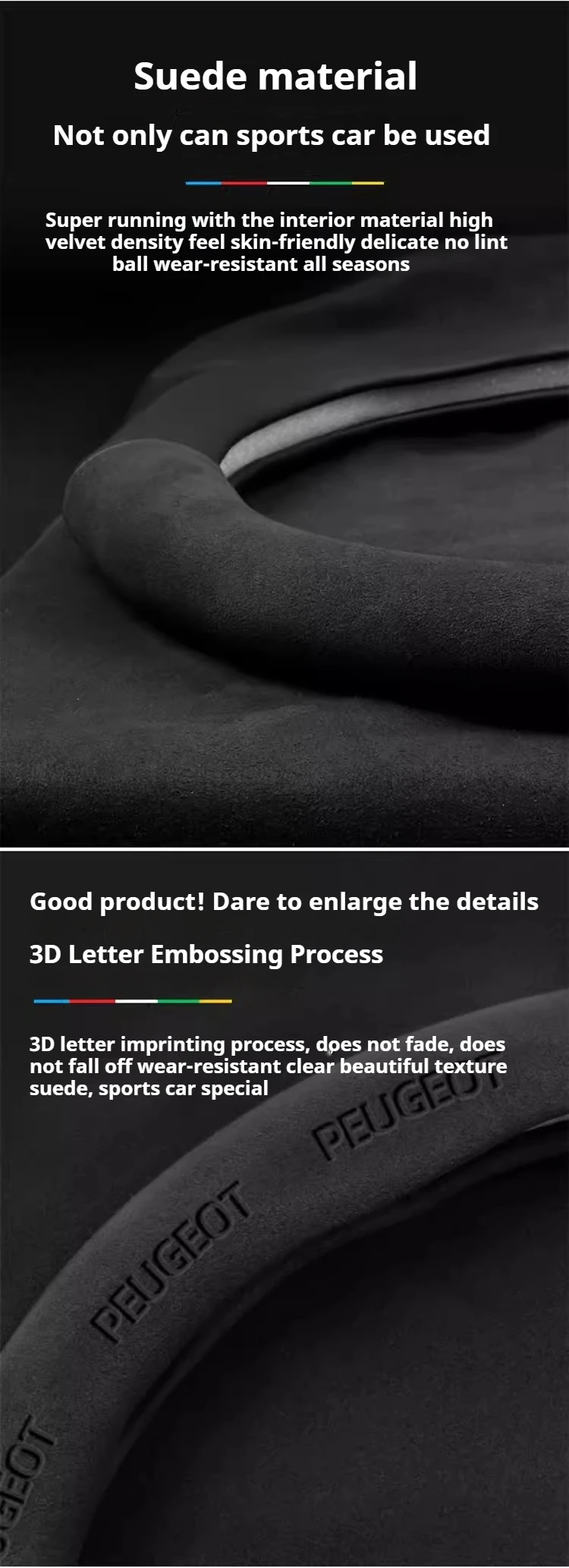 Premium suede leather steering wheel cover designed specifically for Peugeot models. Features carbon fiber accents and non-slip grip technology for enhanced driving comfort and control. Easy installation with perfect fitment guarantee.