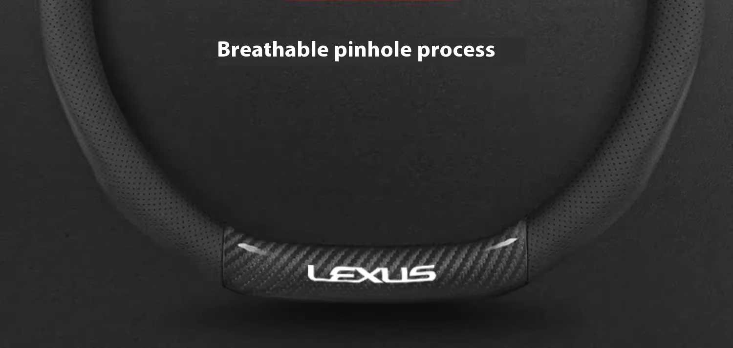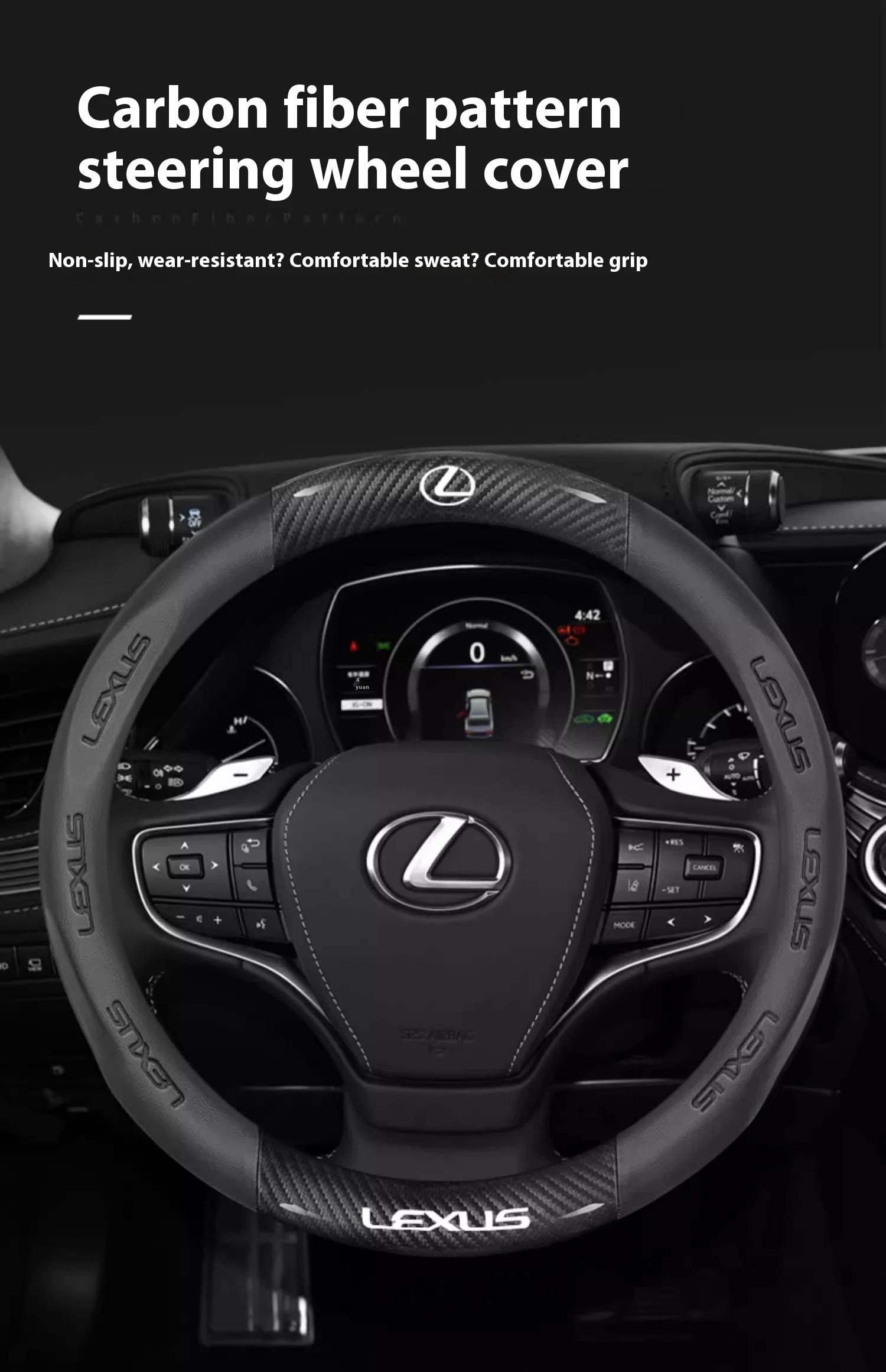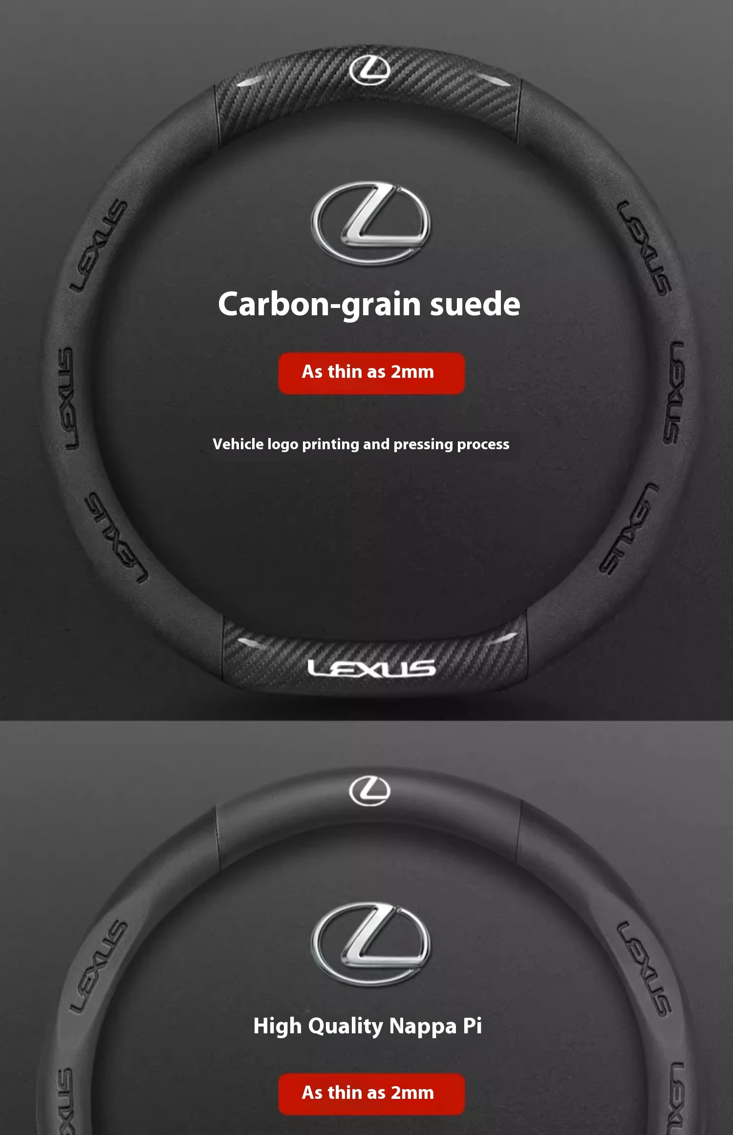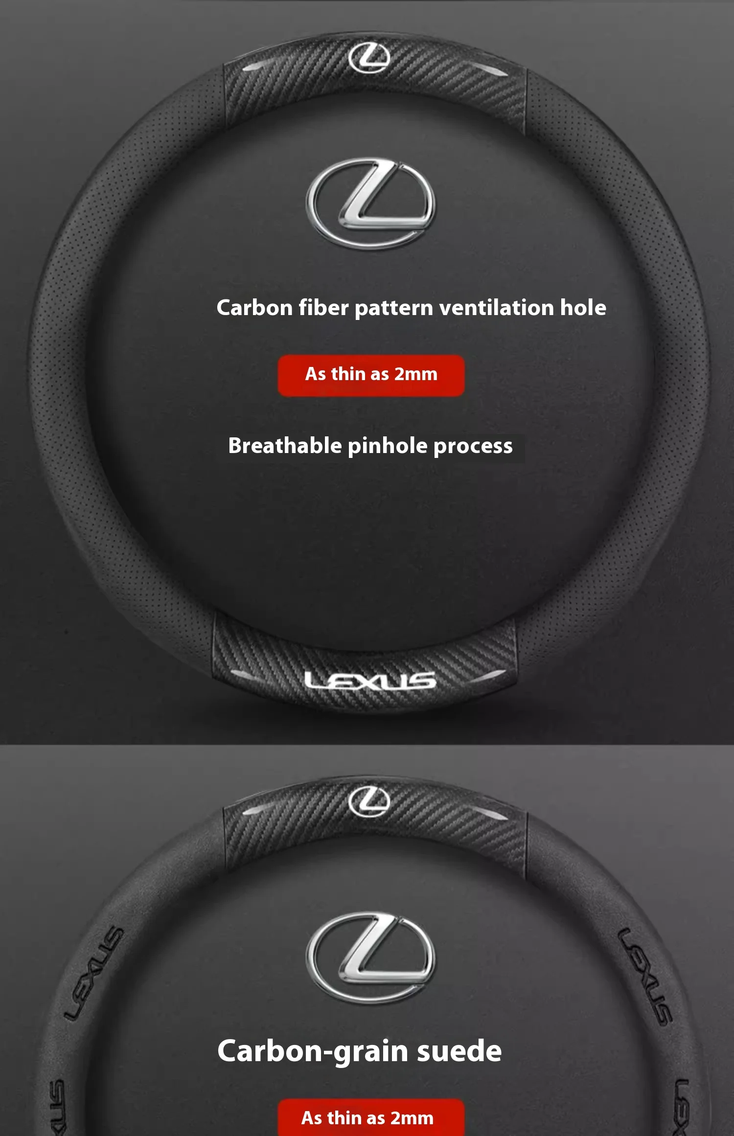 Elevate your Lexus interior with this premium suede leather carbon fiber steering wheel cover. Compatible with ES200, ES260, ES300, RX300, LS500h, GS300, IS250, IS300, CT200h, LX570, GX, NX & UX models.