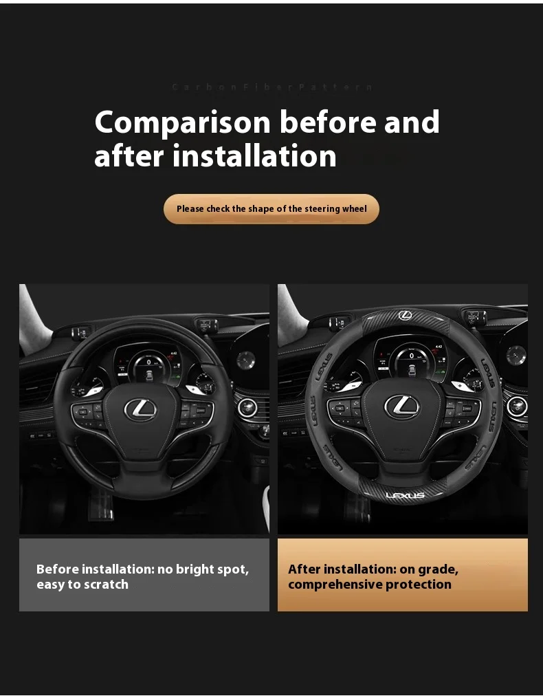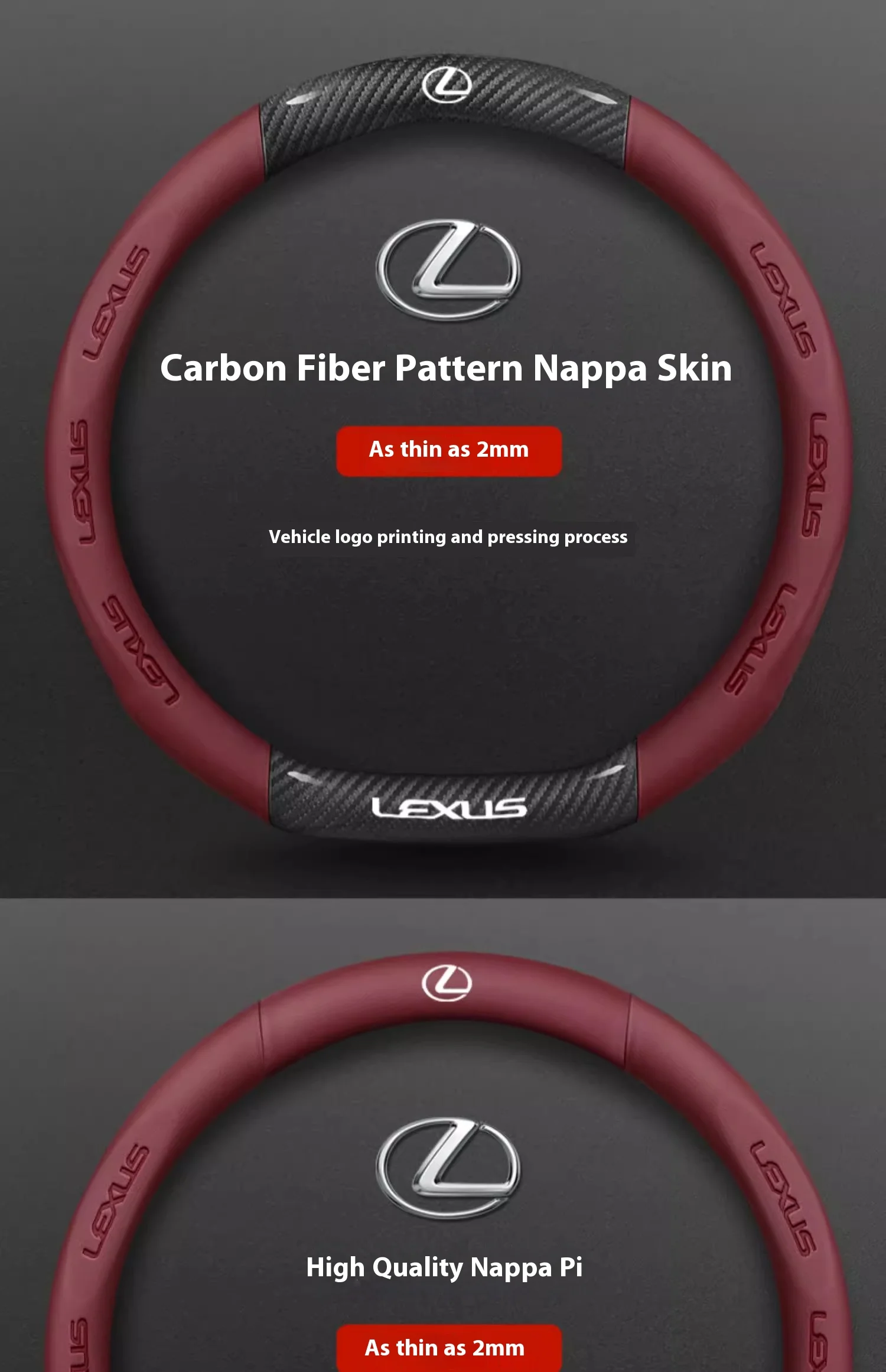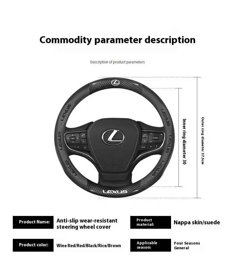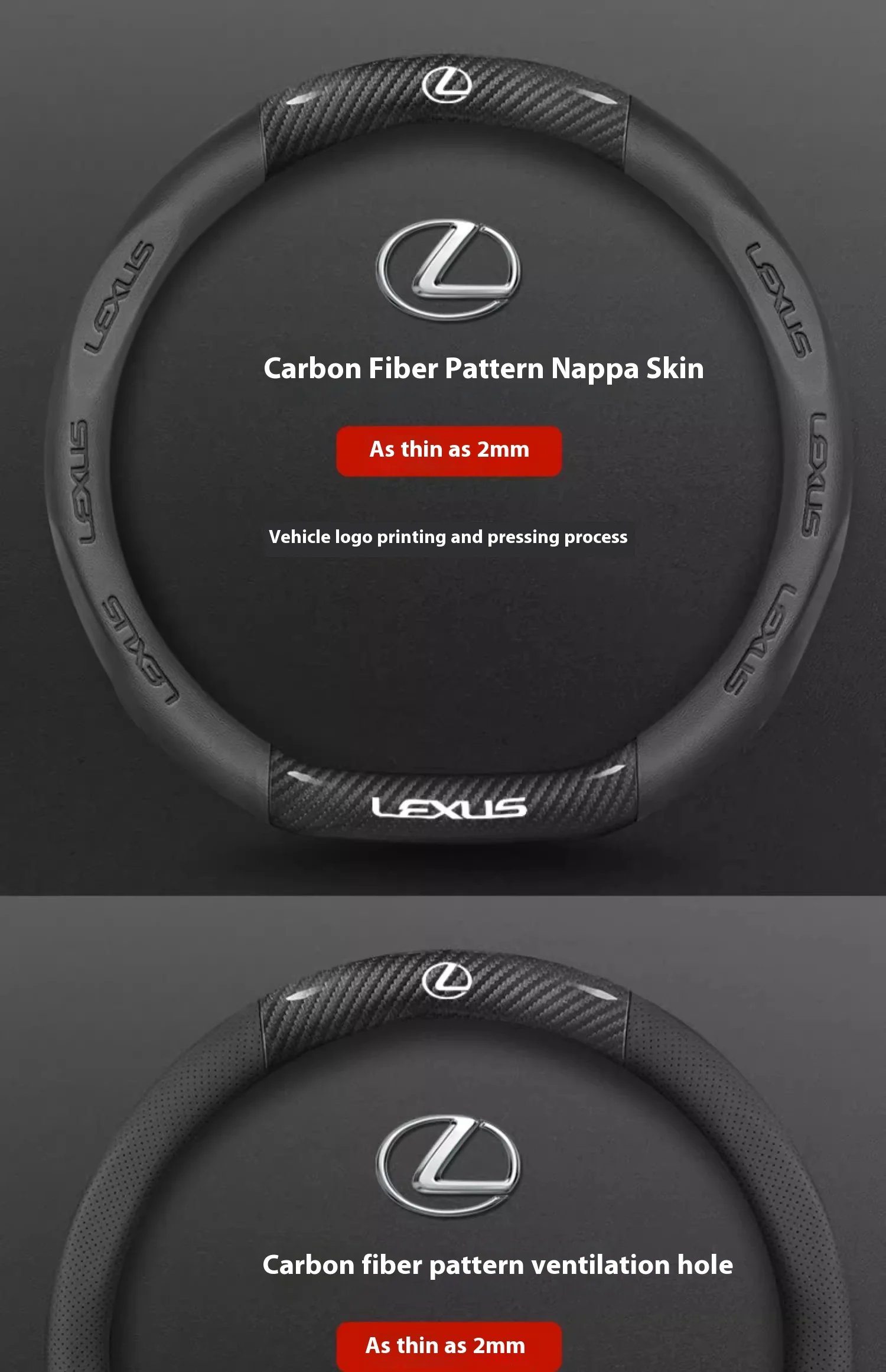 Elevate your Lexus interior with this premium suede leather carbon fiber steering wheel cover. Compatible with ES200, ES260, ES300, RX300, LS500h, GS300, IS250, IS300, CT200h, LX570, GX, NX & UX models.